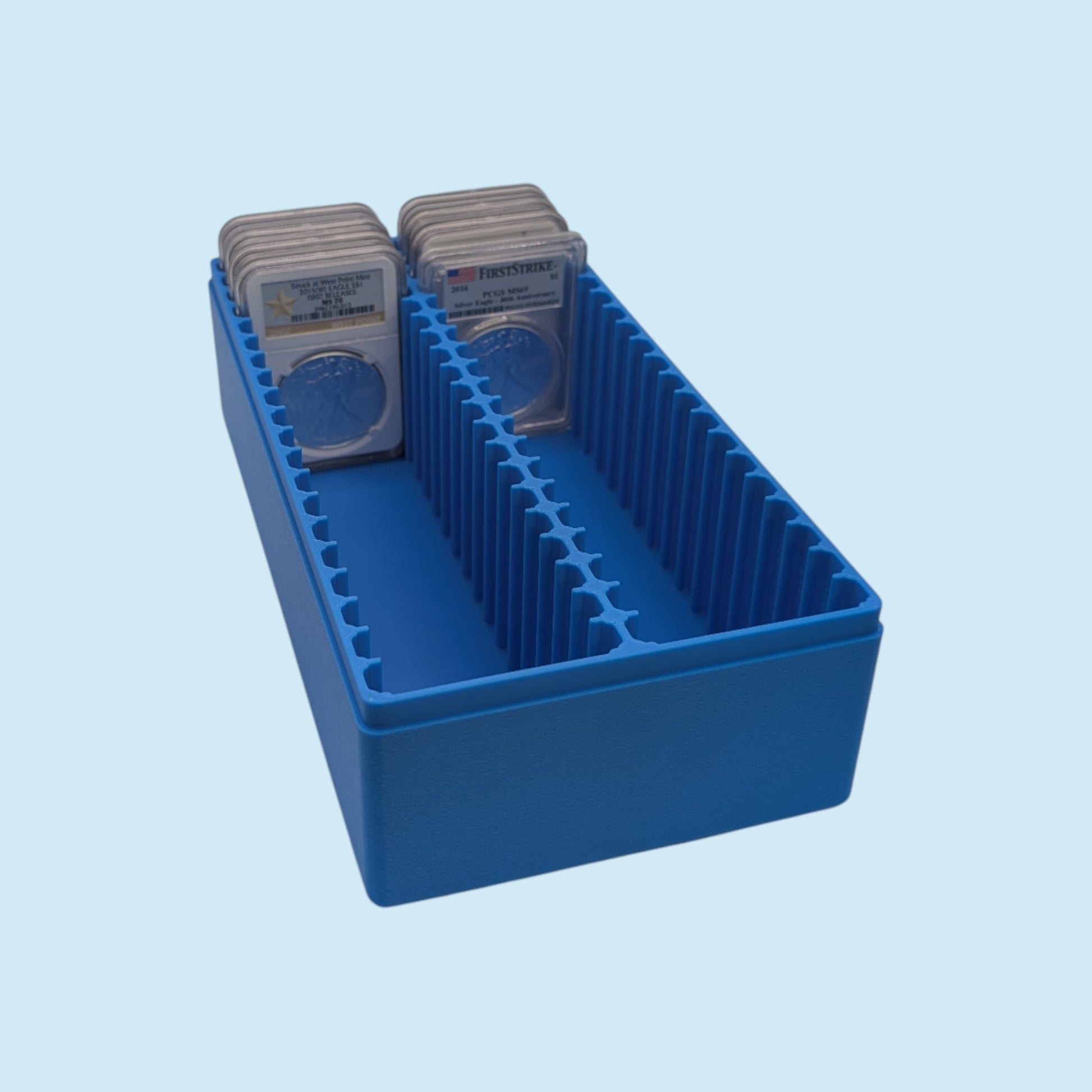 Organize your precious graded coins in style with our custom 3D printed storage boxes! These boxes are designed to hold 40 certified coin slabs, accommodating both NCG and PCGS graded coins.